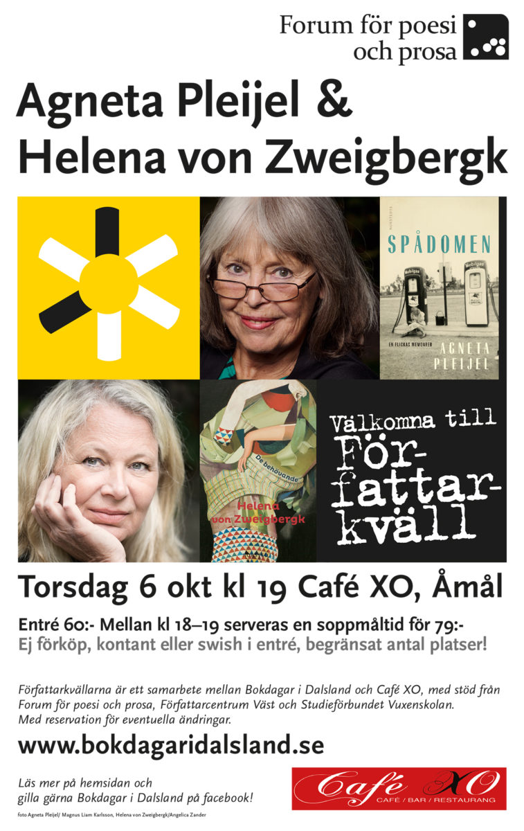 Välkomna på ytterligare en författarkväll i höst på Café XO i Åmål den 6 oktober då vi gästas av Agneta Pleijel och Helena von Zweigbergk !