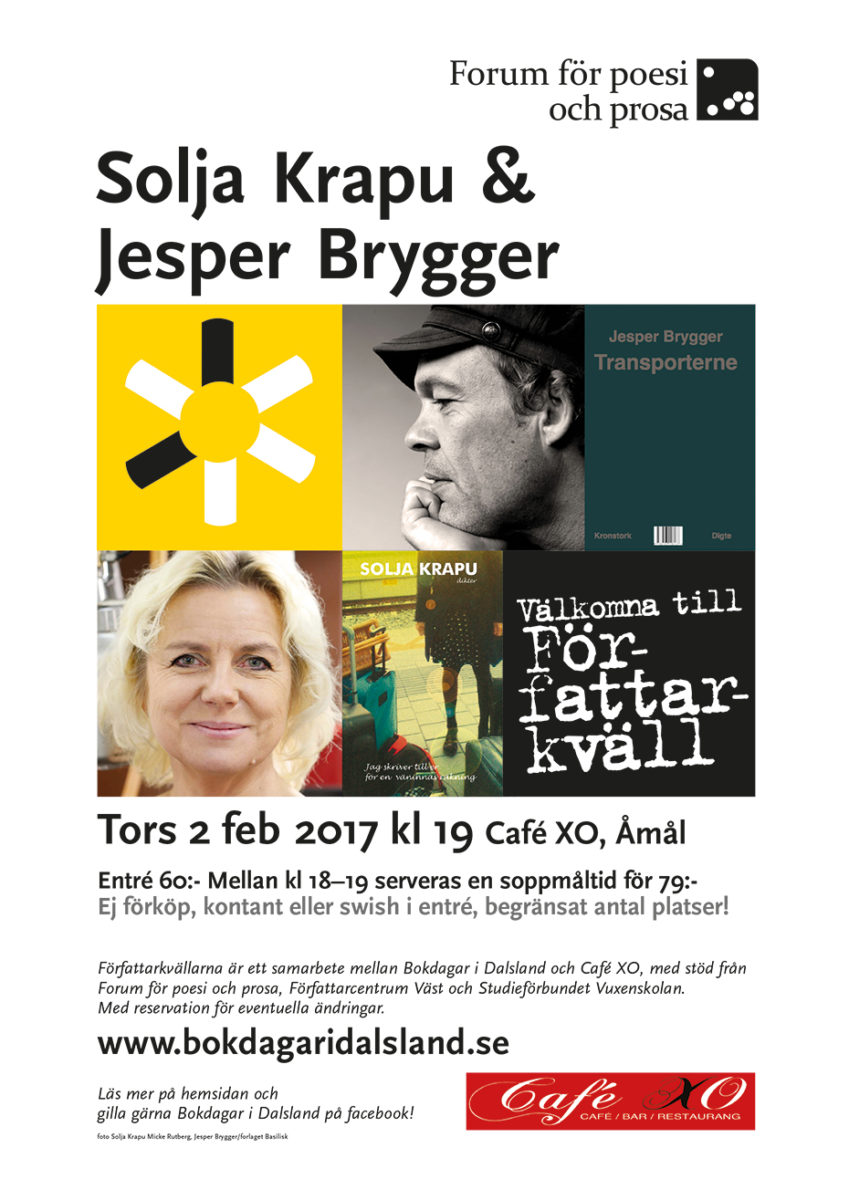Författarkvällarna är ett samarbete mellan Bokdagar i Dalsland och Café XO, med stöd från Forum för poesi och prosa, Författarcentrum Väst och Studieförbundet Vuxenskolan.