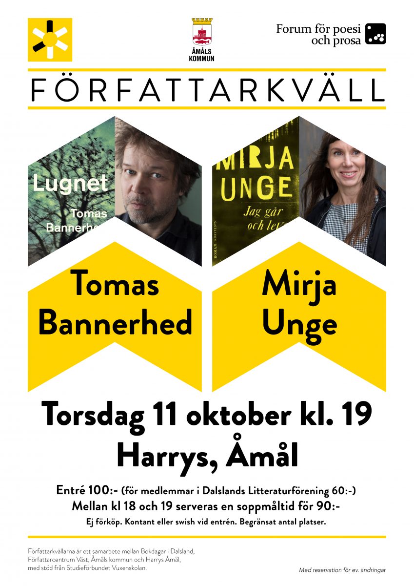 Entré 100:- (för medlemmar i Dalslands Litteraturförening 60:-). Mellan kl 18–19 serveras en soppmåltid på Harrys för 90:-.