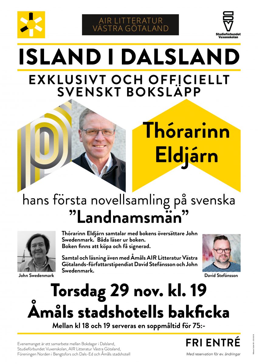 Torsdagen den 29 november arrangerar Bokdagar i Dalsland ett officiellt svenskt boksläpp av den isländska författaren Þórarinn Eldjárns första bok på svenska. Boken, som heter Landnamsmän på svenska, är en novellsamling och släpps samtidigt på fem språk. Landnamsmän består av tre berättelser om isländska bosättare i olika epoker. Under boksläppskvällen, som äger rum på Åmåls stadshotell, samtalar Eldjárn med bokens svenska översättare John Swedenmark, dagens mest framstående översättare av isländsk skönlitteratur till svenska. De kommer också att ge upplästa smakprov på svenska och isländska. Swedenmark har dessutom översatt en novell av Åmåls och Bokdagars AIR författarspidendiat i november och december, Davið Stefánsson. De två kommer också att samtala och läsa under kvällen.