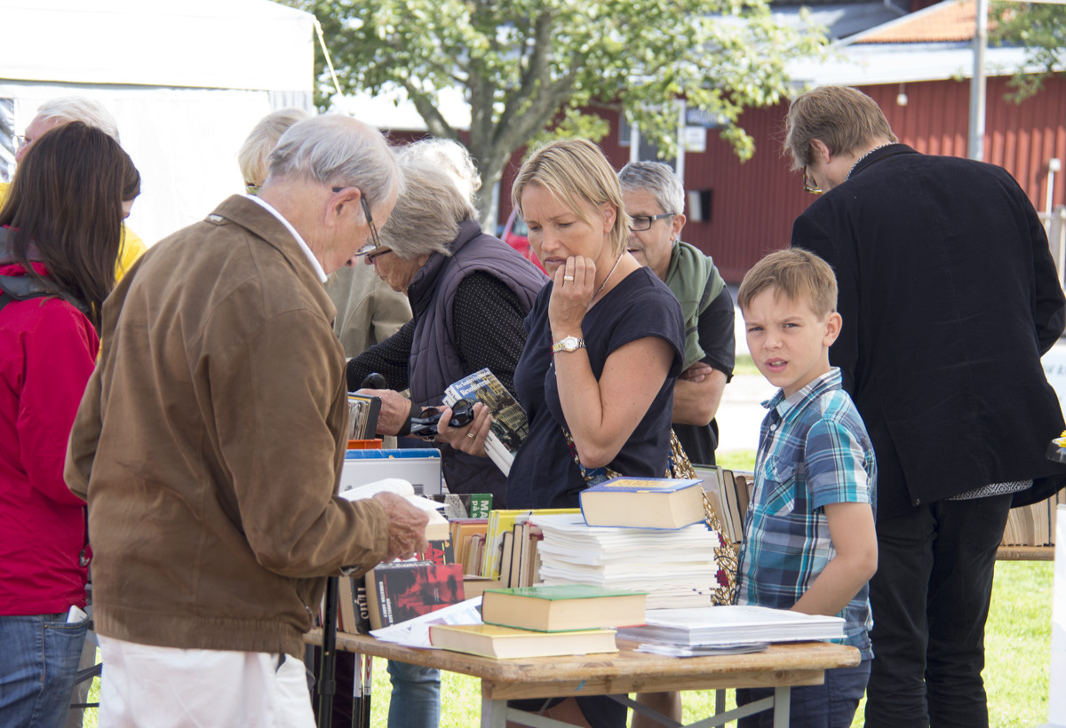 Korpgluggens redaktör Lars Gustavsson som initierad säljare vid Bokbordet under Författardagarna i Åmål.