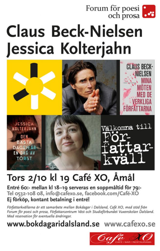 Varmt välkomna på en författarkväll på Café XO i Åmål med Claus Beck Nielsen och Jessica Kolterjahn. Claus Beck-Nielsen dansk dramatiker, skådespelare, musiker och författare. Med berättelsen Selvmordsaktionen från 2006 nominerades…