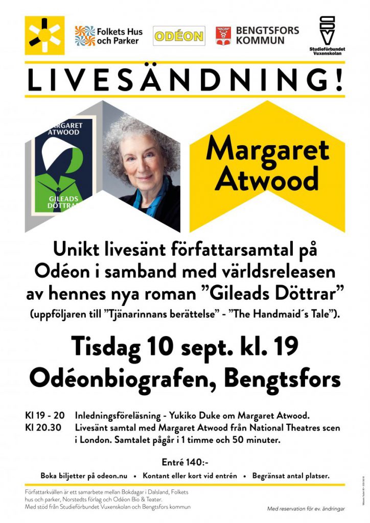 Unikt livesänt författarsamtal med Margaret Atwood 10 september på Odéonbiografen i Bengtsfors i samband med världsreleasen av hennes nya roman, (uppföljaren till ”Tjänarinnans berättelse” – ”The Handmaid´s Tale”). Livesändning och…